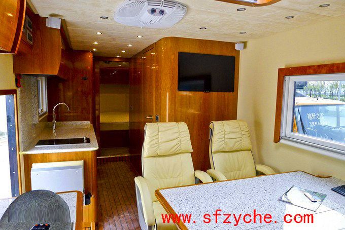 六驅(qū)越野房車車身內(nèi)整體豪華配置:在駕駛室中還有主流卡車中配備的天窗通風(fēng)系統(tǒng)和后排折疊床板,這款越野房車的后排內(nèi)部具有地板加熱系統(tǒng),獨(dú)立的會(huì)客廳,高級(jí)絨布真皮座椅具備多項(xiàng)可調(diào)功能,雖然包裹感不是很強(qiáng),但卻有一定的支撐性,更加符合越野房車的特質(zhì)。此外,中央空調(diào)、天窗與側(cè)窗外加頂部迎賓燈的點(diǎn)綴是恰到好處,前后對(duì)著的兩臺(tái)大尺寸液晶電視方面中央四位乘客觀看。在門口的兩側(cè),分別是吧臺(tái)和迷你廚房,電磁爐、微波爐、冰箱應(yīng)有盡有。車門頂部設(shè)有整車電路控制面板,可通過開關(guān)控制燈光、車門等等。干濕分離的衛(wèi)生間分別分布在客廳旁與臥室中,其中一間設(shè)有浴盆和真空馬桶,另一間則配有恒溫淋浴,走廊的盡頭就是這間臥室,其擁有電控臥室門,獨(dú)立中央空調(diào)、屋內(nèi)整體照明系統(tǒng)與液晶電視,此外整間臥室采用了實(shí)木裝潢,超寬的雙人床鋪?zhàn)銐蜍囍飨碛谩?/span>