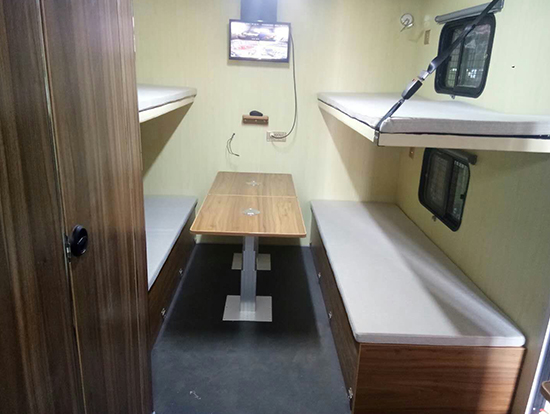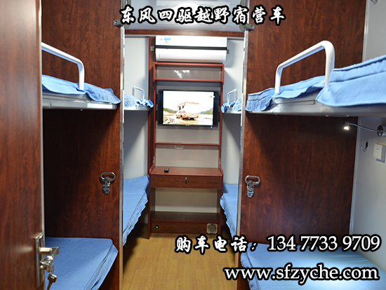 東風(fēng)大型四驅(qū)越野房車滿足更多路況復(fù)雜環(huán)境使用,廂體內(nèi)裝有豪華折疊床、液晶電視、儲(chǔ)物柜、應(yīng)急燈、頂燈、頂置空調(diào)、床墊、被褥、燃油加熱器、頂護(hù)欄、爬梯、隱藏抽拉梯、專用房車門、中空玻璃、戶外燈。由保溫廂體、空氣調(diào)節(jié)系統(tǒng)、宿營(yíng)設(shè)施、影音系統(tǒng)、電氣系統(tǒng)、通風(fēng)換氣系統(tǒng)、洗漱和衛(wèi)生設(shè)施。整個(gè)廂體分為三個(gè)部分,住宿區(qū)、洗漱區(qū)、餐飲區(qū)。住宿區(qū)包括四個(gè)上下鋪,床頭燈,液晶電視,空調(diào)等。洗浴區(qū)包括臉臺(tái),衛(wèi)生間,熱水器等。餐飲區(qū)包括無(wú)煙灶臺(tái),可活動(dòng)餐桌,洗菜盆等。也可以根據(jù)用戶的需要設(shè)計(jì),可增加會(huì)議室,辦公區(qū)等。東風(fēng)大型四驅(qū)越野房車內(nèi)飾圖片: