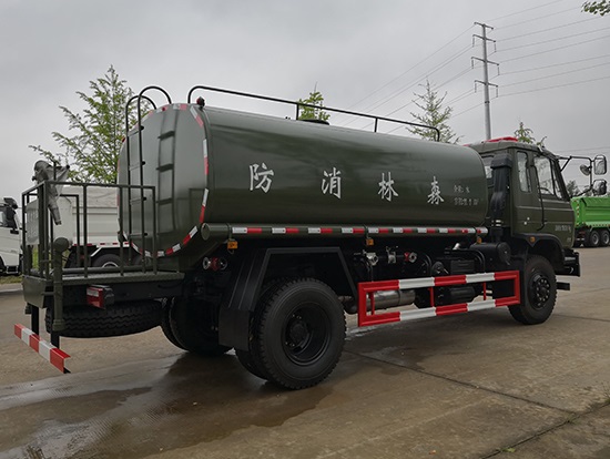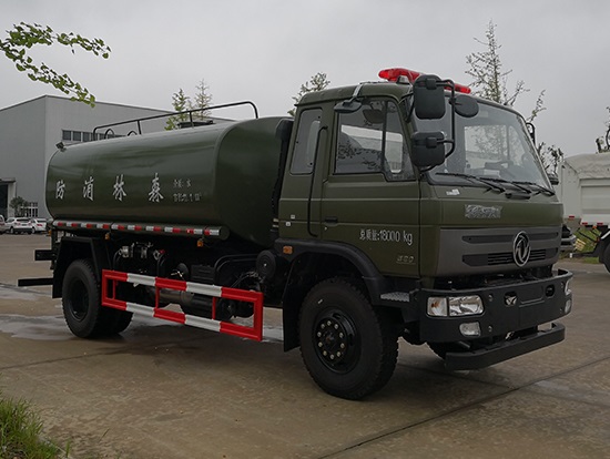 采用東風(fēng)EQ2180GD5DJ型越野汽車(chē)底盤(pán),東風(fēng)一排半寬體駕駛室,4×4驅(qū)動(dòng),康明斯ISB190 50國(guó)五發(fā)動(dòng)機(jī),六檔變速箱,東風(fēng)商用車(chē)橋,前驅(qū)動(dòng)橋3.8噸,后橋10噸,10.00R20輪胎,軸距4500mm,電動(dòng)玻璃,方向助力,斷氣剎,ABS。罐體采用優(yōu)質(zhì)碳鋼QB235板材,板材厚度4mm,罐體容積11.1立方,變速箱安裝取力器,大功率水泵可泵進(jìn)泵出,后置工作平臺(tái)帶水炮射程25米,消防栓接口左右各一個(gè),選裝駕駛室頂部安裝長(zhǎng)條警燈帶喊話器,全車(chē)顏色軍綠,兩側(cè)噴涂白色森林消防字樣。
