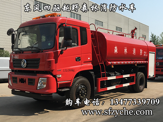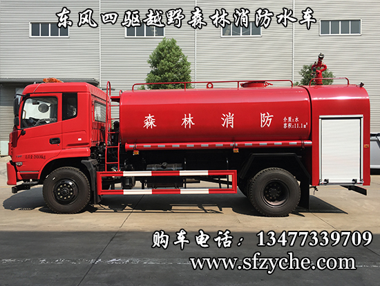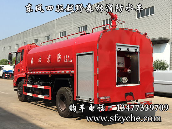 東風(fēng)新款四驅(qū)越野森林消防灑水車_東風(fēng)11.1噸四驅(qū)消防水車_國五四驅(qū)越野森林滅火水車_東風(fēng)4×4越野SCS5183GPSEQ型四驅(qū)綠化噴灑車簡介:采用東風(fēng)EQ2180GD5DJ型越野汽車底盤,東風(fēng)D913新款駕駛室,4×4驅(qū)動,康明斯ISB190 50國五發(fā)動機(jī),六檔變速箱,東風(fēng)商用車橋,前驅(qū)動橋3.8噸,后橋10噸,10.00R20輪胎,軸距4500mm,電動玻璃,方向助力,斷氣剎,ABS。罐體采用優(yōu)質(zhì)碳鋼Q235板材,板材厚度4mm,罐體容積11.1立方,安裝夾心取力器,后置泵箱,消防栓接口左右各一個,消防炮采用PS30-50D消防水炮,流量40L/S/1.0MPa 水射程:≥50m,消防泵采用常壓消防泵型號:CB10/40車用消防泵,流量:40L/s,壓力:1.0MPa,帶前沖,駕駛室頂部安裝長條警燈帶喊話器,全車顏色橘紅,兩側(cè)噴涂白色森林消防字樣。