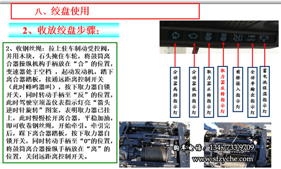2、收鋼絲繩:拉上駐車(chē)制動(dòng)受控閥,并用木塊,石頭掩住車(chē)輪,將鼓筒離合器操縱機(jī)構(gòu)手柄放在“合”的位置,變速器處于空檔 ,起動(dòng)發(fā)動(dòng)機(jī),踏下離合器踏板,接通遠(yuǎn)距離控制開(kāi)關(guān)(此時(shí)蜂鳴器叫),按下取力器自鎖開(kāi)關(guān),同時(shí)轉(zhuǎn)動(dòng)手柄至“反”的位置,此時(shí)駕駛室頂蓋儀表指示燈亮“箭頭逆時(shí)針旋轉(zhuǎn)”圖案,表明取力器已掛上,此時(shí)慢慢松開(kāi)離合器,平穩(wěn)加油,即可收卷鋼絲繩,開(kāi)始牽引。牽引完后,踩下離合器踏板,按下取力器自鎖開(kāi)關(guān),同時(shí)轉(zhuǎn)動(dòng)手柄至“0”的位置,將鼓筒離合器操縱手柄放在“離”的位置,關(guān)閉遠(yuǎn)距離控制開(kāi)關(guān)。