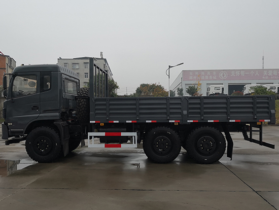 東風(fēng)新款國(guó)五六驅(qū)越野貨車配置簡(jiǎn)介:采用東風(fēng)EQ2220GD5DJ型越野汽車底盤,東風(fēng)D913豪華駕駛室,6×6驅(qū)動(dòng),康明斯ISB190 50國(guó)五發(fā)動(dòng)機(jī),六檔變速箱,標(biāo)配315/80R22.5 20PR可換為12.5R20真空越野輪胎,軸距3500+1250mm,加厚雙層大梁,電動(dòng)玻璃,方向助力,斷氣剎,ABS,備胎一套,大箱長(zhǎng)度5米,墻板高度600mm。