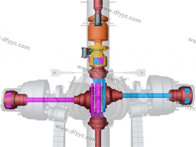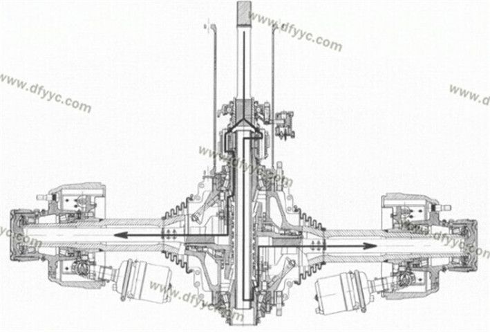 另外,這種斷開(kāi)式車橋的輪間差速器并不在橋包中,而是被轉(zhuǎn)移到了脊柱套管了,左右側(cè)車輪分別由兩套錐齒輪驅(qū)動(dòng),為了讓這兩套錐齒輪互不干涉,其左右半軸在縱向錯(cuò)開(kāi)了一定的距離,也就是說(shuō)它的兩個(gè)半軸并不在一個(gè)平面內(nèi)。類似的設(shè)計(jì)手法裝載機(jī)(4X4軸轉(zhuǎn)向的裝載機(jī))上也有使用,還有采用錯(cuò)開(kāi)一定角度的做法來(lái)避免左右錐齒輪互相干涉的情況。