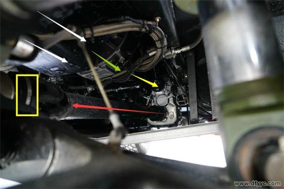東風(fēng)四驅(qū)裝甲防雷反恐戰(zhàn)車為前置動力、實時四輪驅(qū)動設(shè)定,縱置發(fā)動機(白色箭頭)直接與變速器(綠色箭頭)剛性連接,通過中間傳動軸(黃色箭頭)至分動器,在經(jīng)過前傳動軸(紅色箭頭)與后傳動軸將動力輸出至前后驅(qū)動橋。